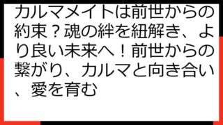 カルマメイトは前世からの繋がり?深掘りする輪廻転生と魂の絆 この記事では、「カルマメイト 前世」というキーワードに焦点を当て、スピリチュアルな視点から、魂の繋がりについて深く掘り下げていきます。 カルマメイトとは何か、前世との関係性、そして...