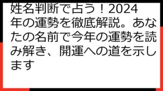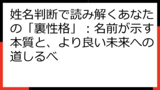 【姓名判断 高島易断】あなたの運命を読み解く!姓名の奥義と開運への道 あなたの名前には、あなたの人生を照らす力、そして未来を切り開くヒントが隠されています。 このブログ記事では、姓名判断の奥義を紐解き、特に高島易断に焦点を当て、あなたの運命...