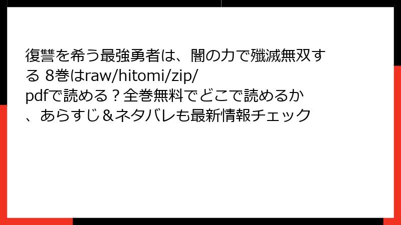 - の見出しタグから始めて、ブログ記事形式で出力して。複数の タグを使用して、読み応えがあるように。HTMLで出力。 や などの箇条書きのHTMLタグや、tableタグも使用してOK。ただし、リンクやURLは、絶対に、挿入しない。 この漫画・コミックの、ネタバレ情報を詳しく。単一の の見出しタグから始めて、ブログ記事形式で出力して。複数の タグを使用して、読み応えがあるように。HTMLで出力。 や などの箇条書きのHTMLタグや、tableタグも使用してOK。ただし、リンクやURLは、絶対に、挿入しない。 この漫画・コミックを、raw/hitomi/zip/pdf/漫画バンクなどの海賊版サイトで読むことのリスクを、詳しく。単一の の見出しタグから始めて、ブログ記事形式で出力して。複数の タグを使用して、読み応えがあるように。HTMLで出力。 や などの箇条書きのHTMLタグや、tableタグも使用してOK。ただし、リンクやURLは、絶対に、挿入しない。 『復讐を希う最強勇者は、闇の力で殲滅無双する』レビュー・口コミ・評判詳細