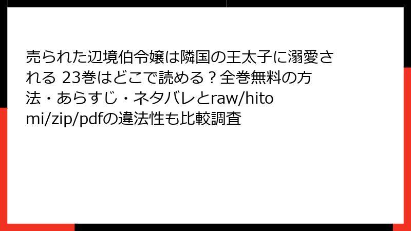海賊版サイトのリスクを避けるためには、合法的なプラットフォームを利用することが推奨されます。『売られた辺境伯令嬢は隣国の王太子に溺愛される』を安全に楽しむための選択肢として、以下のようなサービスがあります。