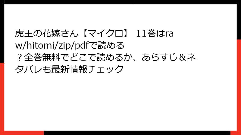 - 公式電子書籍サービス: 小学館の公式アプリや、ブックライブ、Kindle、楽天Koboなどのプラットフォームでは、「虎王の花嫁さん【マイクロ】」の最新巻が購入可能です。初回購入割引や無料試し読みも利用できます。
