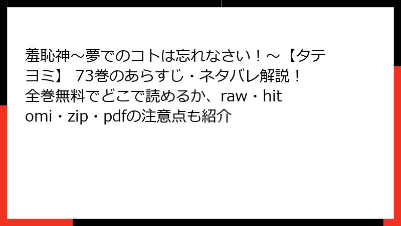 『羞恥神~夢でのコトは忘れなさい!~【タテヨミ】』は、ユニークな設定と魅力的なキャラクターで人気のラブコメマンガです。しかし、raw、hitomi、zip、pdf、漫画バンクなどの海賊版サイトでこの作品を読むことは、重大なリスクを伴います。本記事では、海賊版サイトを利用することの危険性を詳細に解説し、なぜ正規のプラットフォームを選ぶべきかをブログ形式で説明します。法的、倫理的、技術的な観点から、読み応えのある内容をお届けします。