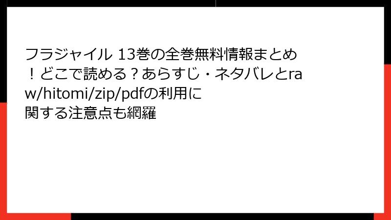 - 更新の遅れ: 海賊版サイトは最新巻のアップロードが遅れることが多く、13巻のような新刊をすぐに読めない場合があります。
