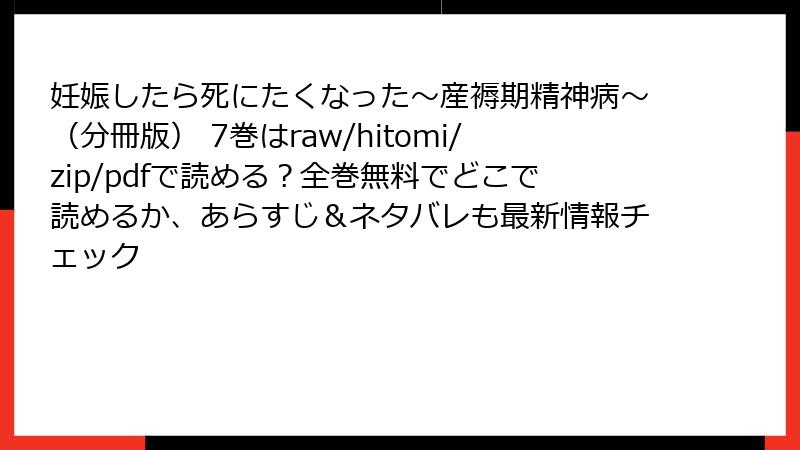 『妊娠したら死にたくなった~産褥期精神病~』は、橘ちなつによる産褥期精神病の壮絶な体験を描いたコミックで、妊娠・出産をめぐる精神的な苦しみをリアルに表現しています。第7巻は、主人公・千夏の精神病院での生活や、彼女の心の葛藤、そして回復への小さな一歩が描かれる重要な巻です。この記事では、第7巻の詳細なネタバレ情報をブログ形式で解説します。物語の核心に迫る内容を含むため、まだ読んでいない方はご注意ください。以下、主要な展開を