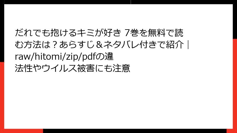 『だれでも抱けるキミが好き』は、武田スーパーによる人気の青年漫画で、ヤングマガジンでの連載や単行本が多くのファンに愛されています。しかし、インターネット上にはraw、hitomi、zip、pdf、漫画バンクなどの海賊版サイトが存在し、無料で漫画を読めるとして一部で利用されています。これらのサイトで漫画を読むことは、重大なリスクを伴います。この記事では、『だれでも抱けるキミが好き』を海賊版サイトで読むことの危険性について、法的、倫理的、技術的な観点から詳しく解説します。無料で読める誘惑に負ける前に、以下のリスクを理解しておきましょう。