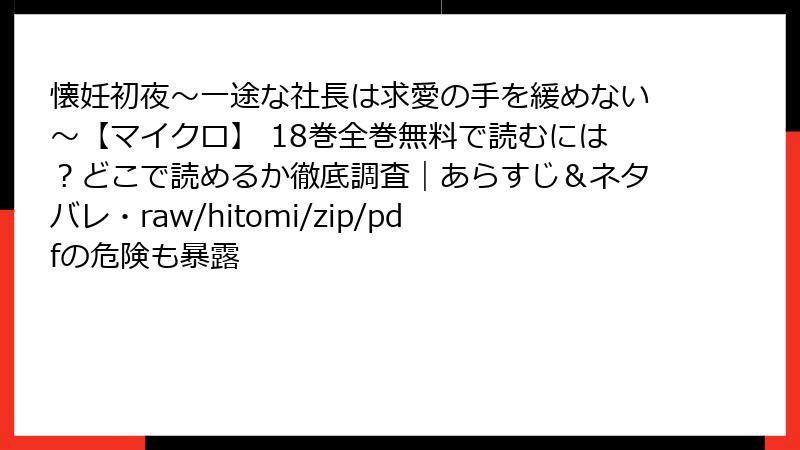 『懐妊初夜~一途な社長は求愛の手を緩めない~【マイクロ】 18巻』は、兎山もなかと京町妃紗による人気少女漫画で、情熱的なラブストーリーが多くのファンを魅了しています。しかし、このような人気作品をraw、hitomi、zip、pdf、漫画バンクなどの海賊版サイトで読むことは、重大なリスクを伴います。本記事では、海賊版サイトを利用することの危険性を詳細に解説し、なぜ合法的な方法で漫画を楽しむべきかをブログ形式で紹介します。以下、複数の