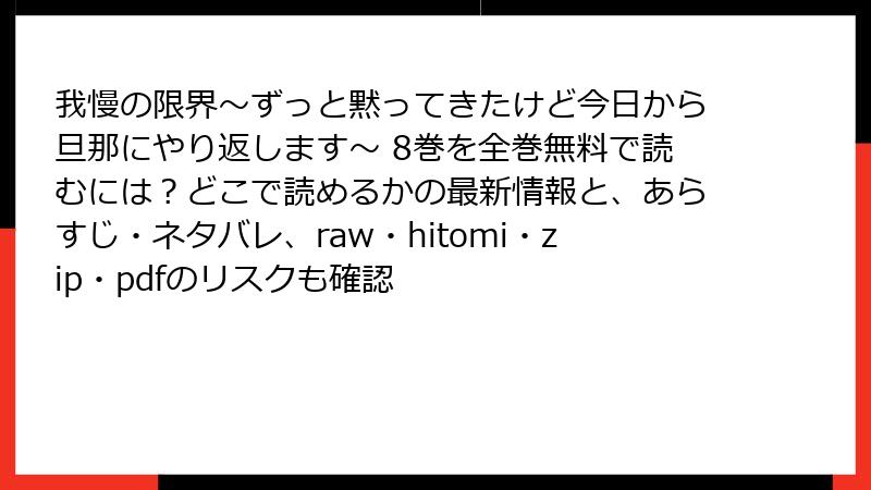 「我慢の限界~ずっと黙ってきたけど今日から旦那にやり返します~」は、モラハラ夫に立ち向かう妻・美菜保の反撃を描いた人気漫画で、8巻では物語がさらに劇的な展開を迎えています。この巻は、読者の間で大きな話題となり、SNSやレビューサイトで多くの感想が寄せられています。本記事では、8巻のレビュー、口コミ、評判を詳しく掘り下げ、読者の声や作品の魅力、議論のポイントをブログ形式で解説します。ネタバレを避けつつ、物語のテーマやキャラクターへの反応を中心に、読み応えのある内容でお届けします。以下、読者がどのような点でこの巻を評価しているのか、具体的な声を基に分析します。