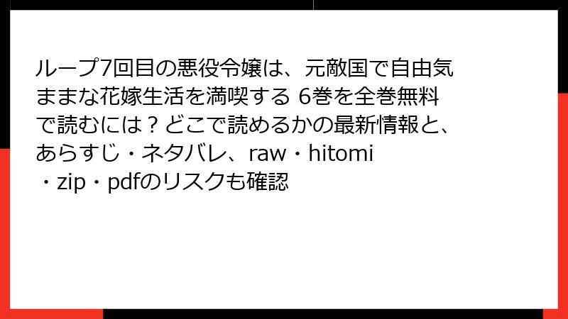 「ループ7回目の悪役令嬢は、元敵国で自由気ままな花嫁生活を満喫する」は、雨川透子による原作ライトノベルを木乃ひのきがコミカライズした人気作品です。この魅力的な漫画を無料で読むために、raw、hitomi、zip、pdf、漫画バンクなどの海賊版サイトを利用することを考える人もいるかもしれません。しかし、これらのサイトを利用することは、法的、倫理的、そして技術的なリスクを伴います。この記事では、海賊版サイトで漫画を読むことの危険性を詳しく解説し、なぜ公式な手段で楽しむべきかを明らかにします。