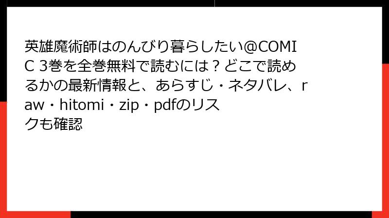 - 欠落や改変: 一部の海賊版では、ページが欠けていたり、勝手に編集されたりすることがあります。『英雄魔術師はのんびり暮らしたい@COMIC』のジンとベルの掛け合いや、福成冠智の緻密なアートを十分に楽しめない可能性があります。