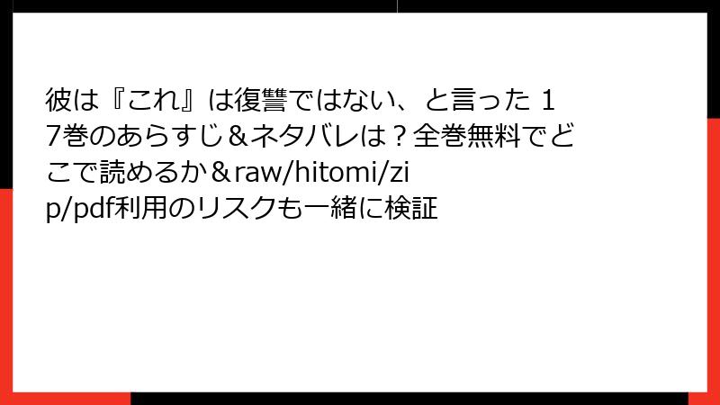 『彼は『これ』は復讐ではない、と言った』は、高井唯人による人気の復讐サスペンス漫画で、コミックシーモアで独占配信されています。しかし、raw、hitomi、zip、pdf、漫画バンクなどの海賊版サイトでこの漫画を読むことを検討する人もいるかもしれません。これらの海賊版サイトを利用することは、一見無料で手軽に見えるかもしれませんが、法的、倫理的、そして技術的なリスクを伴います。この記事では、こうした海賊版サイトで『彼は『これ』は復讐ではない、と言った』を読むことの具体的なリスクを、ブログ記事形式で詳しく解説します。