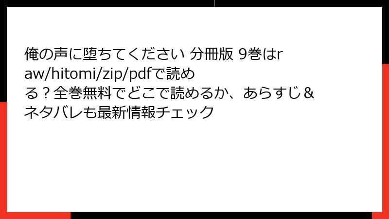 「俺の声に堕ちてください」は、tenによる女性向け恋愛マンガで、講談社の姉フレンドコミックスから刊行されている人気作品です。30歳のOL・あかりと、年下の後輩・柳田くんの「イケボ」を軸にした甘いオフィスラブストーリーが、多くの読者を魅了しています。この記事では、9巻を含む「俺の声に堕ちてください 分冊版」のレビュー、口コミ、評判を詳しくまとめ、読者の反応や作品の魅力を深掘りします。以下は、さまざまな電子書籍プラットフォームや読者の声をもとに、作品の評価を整理した内容です。