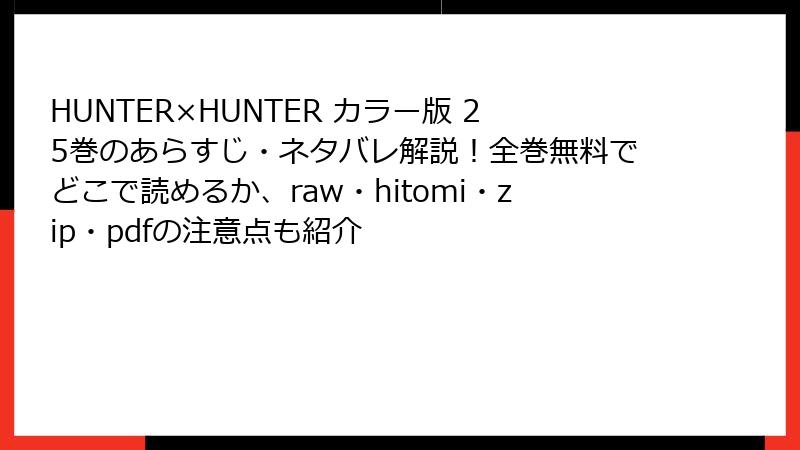 各サービスは、クーポンやポイント還元を活用することでコストを抑えられ、カラー版の鮮やかなビジュアルを安全に楽しめます。違法な海賊版サイト(raw、hitomi、漫画バンクなど)は、マルウェアや法的リスクを伴うため絶対に避けましょう。『HUNTER×HUNTER』カラー版 25巻の壮絶な戦闘と深いストーリーを、正規の電子書籍サービスで存分に堪能してください!