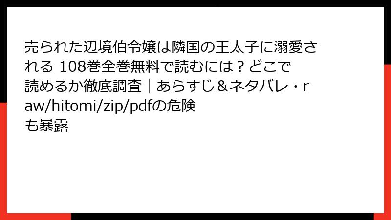 『売られた辺境伯令嬢は隣国の王太子に溺愛される』は、小椋あんによる人気のファンタジー漫画で、その魅力的なストーリーとキャラクターが多くの読者を惹きつけています。しかし、この漫画をraw、hitomi、zip、pdf、漫画バンクなどの海賊版サイトで読むことは、さまざまなリスクを伴います。この記事では、海賊版サイトを利用することの危険性を、法的、倫理的、技術的な観点から詳しく解説します。以下に、具体的なリスクを複数の視点から掘り下げ、なぜ公式なプラットフォームを利用すべきかを説明します。