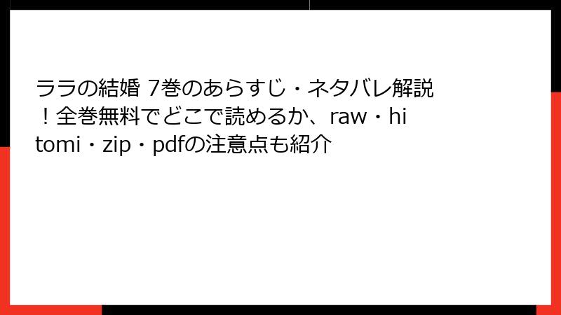 『ララの結婚』は、ためこう先生による人気のBLコミックで、情熱的なストーリーと美しい作画が多くのファンを魅了しています。しかし、raw、hitomi、zip、pdf、漫画バンクなどの海賊版サイトでこの作品を読むことは、重大なリスクを伴います。この記事では、海賊版サイトを利用することの危険性を詳細に解説し、合法的な方法で楽しむことの重要性を訴えます。『ララの結婚』を安全に楽しみたい方のために、リスクを具体的に掘り下げます。