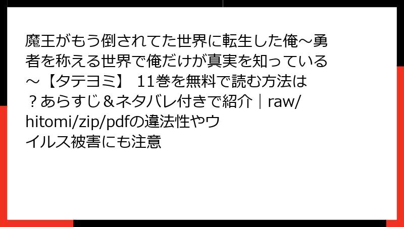 『魔王がもう倒されてた世界に転生した俺~勇者を称える世界で俺だけが真実を知っている~【タテヨミ】』は、魅力的なストーリーとキャラクターで多くのファンを惹きつける人気のタテヨミ漫画です。しかし、この漫画をraw、hitomi、zip、pdf、漫画バンクなどの海賊版サイトで読むことは、重大なリスクを伴います。この記事では、こうした海賊版サイトを利用することの危険性を、法的、倫理的、技術的な観点から詳しく解説します。以下では、具体的なリスクを項目ごとに掘り下げ、なぜ正規のプラットフォームを利用すべきかを明らかにします。