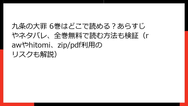 『九条の大罪』は、真鍋昌平による人気漫画で、その深い人間ドラマと法とモラルの葛藤が多くの読者を魅了しています。しかし、この作品をraw、hitomi、zip、pdf、漫画バンクなどの海賊版サイトで読むことは、重大なリスクを伴います。海賊版サイトを利用することは一見手軽に見えますが、法的、倫理的、そして技術的な問題が潜んでいます。以下では、これらのリスクを詳細に解説し、なぜ正規の方法で読むべきかを説明します。