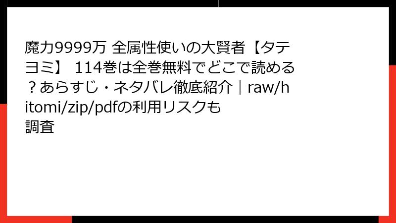 『魔力9999万 全属性使いの大賢者【タテヨミ】』は、HykeComicで配信される人気のフルカラータテヨミ漫画です。しかし、この作品をraw、hitomi、zip、pdf、漫画バンクなどの海賊版サイトで読むことは、法的、倫理的、技術的な観点から多くのリスクを伴います。この記事では、こうした海賊版サイトを利用することの危険性を詳細に解説し、なぜ公式プラットフォームで読むべきかをブログ形式で説明します。以下、具体的なリスクを