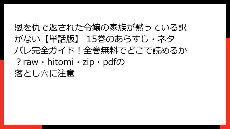 「恩を仇で返された令嬢の家族が黙っている訳がない【単話版】 15巻」は、七ツ河ほづみによる人気の女性向け漫画で、復讐と家族の絆を描いたスカッとするファンタジー作品です。コミックシーモアで独占先行配信されているこのシリーズは、裏切りを受けたレッドサム家の次女セリア・オブ・レッドサムを中心に、家族が一丸となって名誉を取り戻す物語が展開します。以下では、15巻の詳細なネタバレ情報をブログ記事形式で解説し、物語の展開や見どころを深掘りします。物語の核心に触れるため、ネタバレを避けたい方はご注意ください。