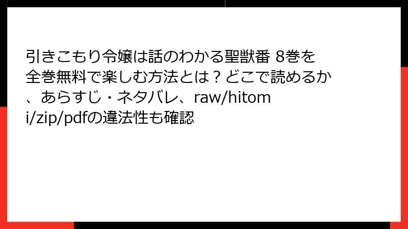 『引きこもり令嬢は話のわかる聖獣番』は、大庭そとによる人気のファンタジーラブコメディ漫画で、聖獣番のミュリエルと騎士団長サイラスの物語が多くのファンを魅了しています。しかし、このような人気作品を、raw、hitomi、zip、pdf、漫画バンクなどの海賊版サイトで読むことは、多くのリスクを伴います。この記事では、海賊版サイトを利用することの危険性を、法的、倫理的、技術的な観点から詳しく解説します。以下の内容は、読者が安全かつ合法的に漫画を楽しむための参考となることを目指しています。