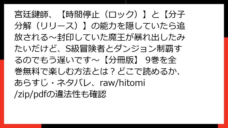 『宮廷鍵師、【時間停止(ロック)】と【分子分解(リリース)】の能力を隠していたら追放される~封印していた魔王が暴れ出したみたいだけど、S級冒険者とダンジョン制覇するのでもう遅いです~【分冊版】 9巻』は、魅力的なファンタジー漫画として多くの読者に愛されています。しかし、raw、hitomi、zip、pdf、漫画バンクなどの海賊版サイトでこの作品を読むことは、重大なリスクを伴います。この記事では、海賊版サイトを利用する際に直面する可能性のある法的、倫理的、技術的な危険について詳しく解説します。以下、
