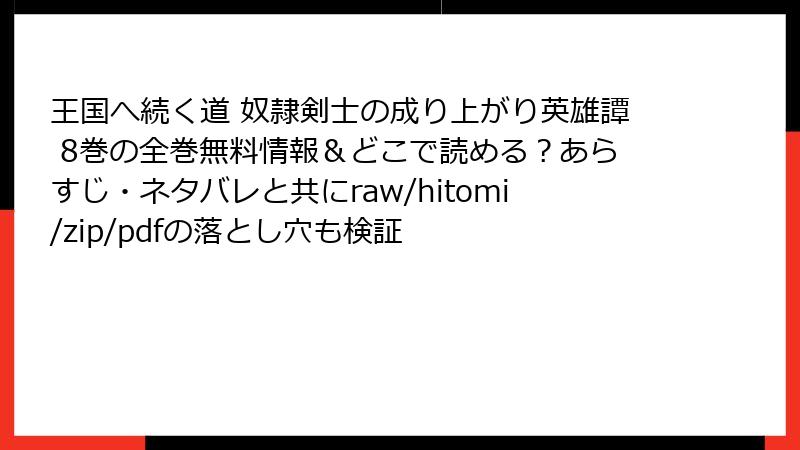 「王国へ続く道 奴隷剣士の成り上がり英雄譚」8巻は、剣闘奴隷から成り上がりを目指す主人公エイギルの壮大な冒険を描いたファンタジーコミックで、原作・湯水快、作画・伊藤寿規、キャラクター原案・日陰影次のタッグによる人気シリーズです。この巻も、戦闘の迫力、キャラクターの魅力、物語の展開が話題となり、ファンや読者から多くのレビューや口コミが寄せられています。以下では、8巻の評判をさまざまな視点から詳細にまとめ、読者の声や評価を紹介します。
