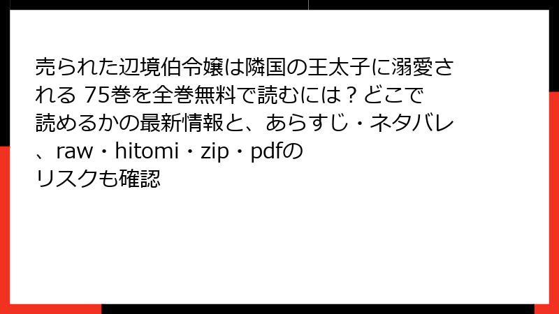 「売られた辺境伯令嬢は隣国の王太子に溺愛される」は、魅力的なストーリーとキャラクターで多くのファンを魅了する人気漫画です。しかし、この作品をraw、hitomi、zip、pdf、漫画バンクなどの海賊版サイトで読むことは、重大なリスクを伴います。海賊版サイトの利用は、法的問題からセキュリティの脅威、さらには倫理的な懸念まで、さまざまな危険を引き起こす可能性があります。この記事では、海賊版サイトを利用するリスクを詳細に解説し、なぜ公式な方法で読むべきかを明らかにします。
