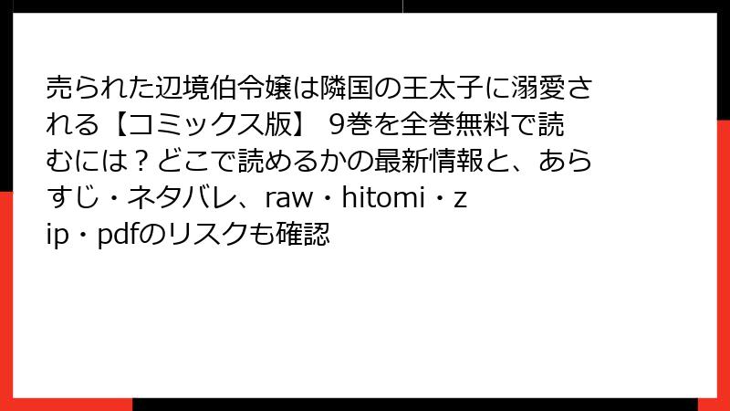 『売られた辺境伯令嬢は隣国の王太子に溺愛される【コミックス版】』は、魅力的なストーリーと美しいアートで多くのファンを魅了する人気漫画です。しかし、この作品をraw、hitomi、zip、pdf、漫画バンクなどの海賊版サイトで読むことは、重大なリスクを伴います。海賊版サイトを利用することは一見手軽に見えるかもしれませんが、法的、倫理的、そして技術的な問題が潜んでいます。この記事では、海賊版サイトで漫画を読むことの危険性を詳細に解説し、なぜ公式なプラットフォームを選ぶべきかを説明します。以下、具体的なリスクを