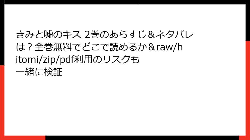『きみと嘘のキス』をraw、hitomi、zip、pdf、漫画バンクなどの海賊版サイトで読むことは、法的な問題、セキュリティリスク、業界へのダメージ、品質の低下など、多くの危険を伴います。これらのリスクを冒す代わりに、公式プラットフォームを利用することで、安全かつ高品質な読書体験を楽しみながら、好きな作品やクリエイターを応援できます。マンガ業界の未来を守るためにも、ぜひ正規のルートで『きみと嘘のキス』の世界に浸ってみてください。ユウとリョウの切ない恋物語を、安心して心から楽しむために、公式版を選びましょう!