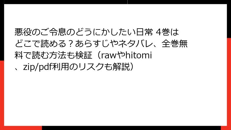 『悪役のご令息のどうにかしたい日常』4巻は、馬のこえが聞こえるによる原作小説をふわい にむがコミカライズした、癒し系異世界転生ファンタジーの人気作です。しかし、このような人気作品は、raw、hitomi、zip、pdf、漫画バンクなどの海賊版サイトで違法に公開されることがあります。これらのサイトで漫画を読むことは、一見手軽に思えるかもしれませんが、重大なリスクが伴います。この記事では、海賊版サイトを利用することの危険性を、法的、倫理的、技術的な観点から詳しく解説します。