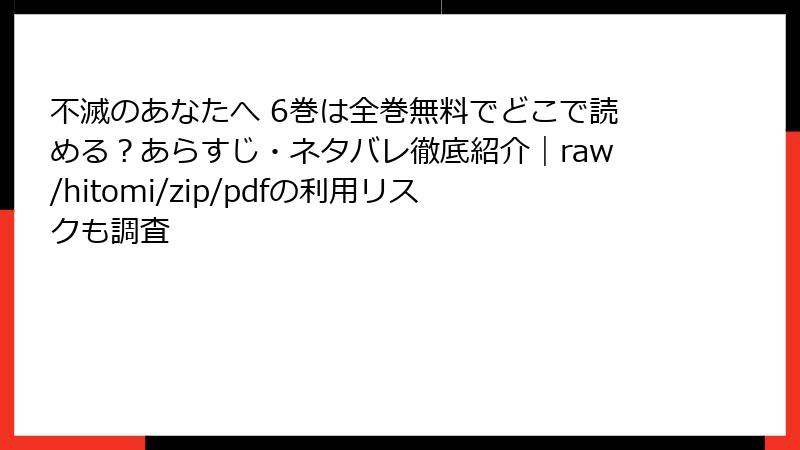 『不滅のあなたへ』をraw、hitomi、zip、pdf、漫画バンクなどの海賊版サイトで読むことは、法的な処罰、倫理的な問題、技術的なリスク、経済的・社会的な悪影響を伴います。これらのサイトは一見無料で便利に見えますが、作者や業界への敬意を欠き、自身のデバイスや個人情報を危険に晒す行為です。代わりに、正規のプラットフォームを利用することで、高品質なコンテンツを安全に楽しみ、好きな作品や作者を直接サポートできます。『不滅のあなたへ』の深い物語と感動を、正当な方法で味わい、漫画業界の未来を守りましょう。