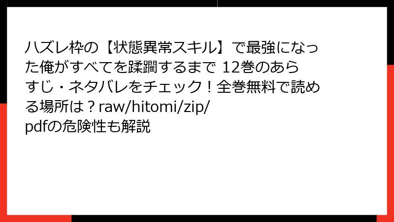 『ハズレ枠の【状態異常スキル】で最強になった俺がすべてを蹂躙するまで』は、篠崎芳原作の人気ダークファンタジー漫画で、熱心なファンが多い作品です。しかし、raw、hitomi、zip、pdf、漫画バンクなどの海賊版サイトでこの漫画を読むことは、重大なリスクを伴います。これらのサイトは無料で漫画を提供する一方で、法的、倫理的、技術的な問題を引き起こします。この記事では、海賊版サイトを利用するリスクを詳細に解説し、なぜ公式なプラットフォームを選ぶべきかを明らかにします。