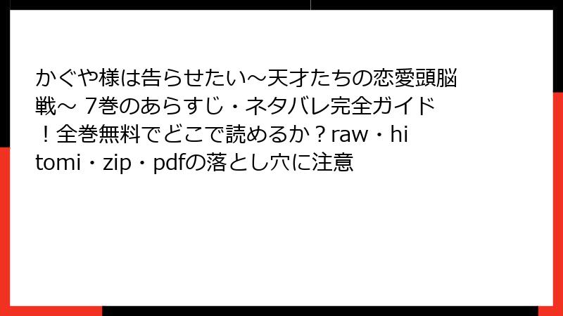 まとめ: 『かぐや様は告らせたい~天才たちの恋愛頭脳戦~』をraw、hitomi、zip、pdf、漫画バンクなどの海賊版サイトで読むことは、法的、倫理的、技術的、品質的、社会的なリスクを伴います。違法行為による処罰の可能性、作者や業界へのダメージ、個人情報漏洩やマルウェア感染、劣悪なコンテンツ品質、コミュニティからの孤立など、無料で読むことの代償はあまりにも大きいです。この素晴らしい作品を正規に購入し、作者を応援しながら安全かつ高品質な体験を楽しむことを強くおすすめします。好きな漫画を長く愛し続けるために、正規版を選びましょう!
