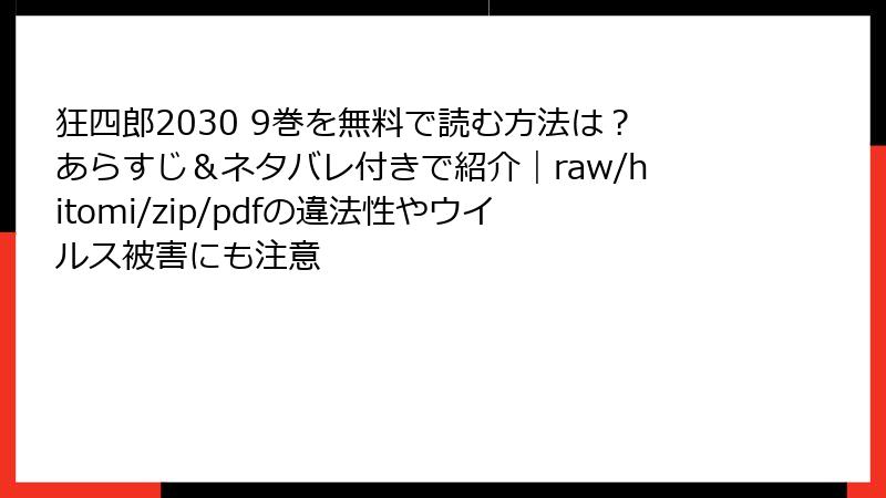 『狂四郎2030』は、徳弘正也による人気の近未来SF漫画であり、その過激なストーリーとダイナミックなアクションで多くのファンを魅了しています。しかし、この漫画をraw、hitomi、zip、pdf、漫画バンクなどの海賊版サイトで読むことは、重大なリスクを伴います。これらのサイトは無料で漫画を提供しているように見えますが、利用者にとって法的、倫理的、技術的な危険が潜んでいます。この記事では、『狂四郎2030』を海賊版サイトで読むことの具体的なリスクを詳しく解説し、なぜ正規のプラットフォームを選ぶべきかを明らかにします。以下の章では、それぞれのリスクを深掘りします。