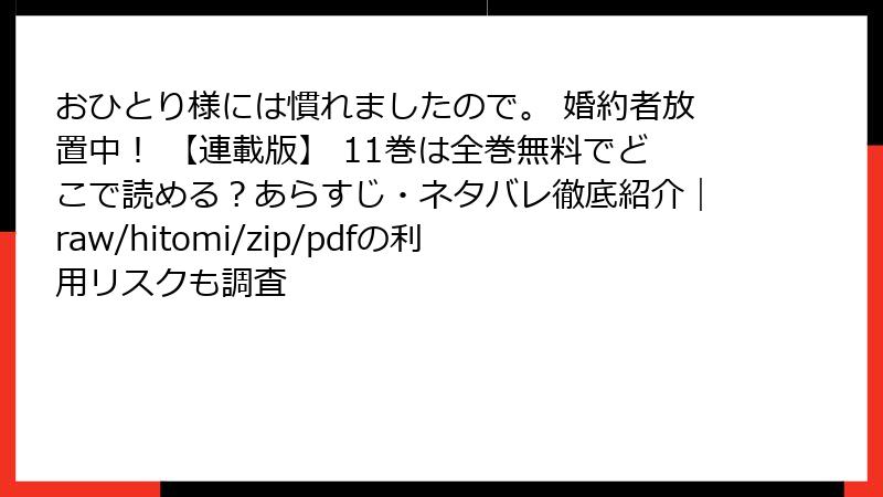 こんにちは、漫画好きの皆さん! 今日は、人気ラブコメディ『おひとり様には慣れましたので。 婚約者放置中! 【連載版】』の11巻について詳しくお話しします。この作品は、原作・荒瀬ヤヒロさん、漫画・晴田巡さんによるコミカライズで、伯爵令嬢ニコルがおひとり様の自由を満喫しつつ、婚約者のケイオスとのすれ違いが繰り広げられるドタバタストーリーです。連載版としてpixivや各種電子書籍で楽しめ、11巻では物語がさらに深みを増し、ニコルの自立とケイオスの本音が交錯する展開が魅力満載! 今回は、全体のあらすじから主要エピソード、キャラクターの成長まで、ネタバレを交えつつ読み応えのある解説をお届けします。まだ読んでいない方はご注意を!
