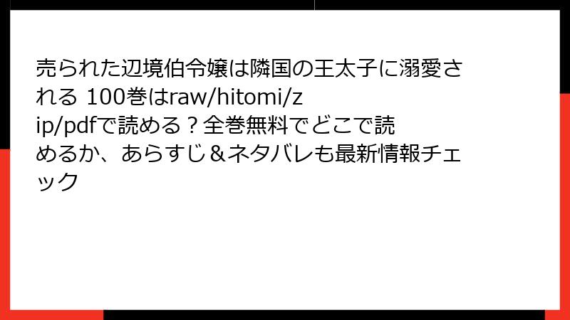 こんにちは、漫画好きの皆さん! 人気ファンタジー・ロマンス漫画『売られた辺境伯令嬢は隣国の王太子に溺愛される』を、raw、hitomi、zip、pdf、漫画バンクなどの海賊版サイトで読もうと考えている方、ちょっと待ってください。この記事では、そんな違法サイトを利用する際の深刻なリスクを、詳しく解説します。2025年現在、海賊版サイトはドメインを変えながら生き残っていますが、利用者はウイルス感染や法的罰則、個人情報漏洩などの危険にさらされています。合法的な楽しみ方を推奨しつつ、なぜ避けるべきかを読み応えのある内容で掘り下げます。あなたのデバイスと安全を守るために、ぜひ最後までお読みください!