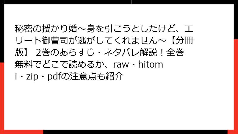 こんにちは、マンガ好きのブロガーです! 今日は、皆さんが気になっているであろう『秘密の授かり婚~身を引こうとしたけど、エリート御曹司が逃がしてくれません~【分冊版】』のような人気コミックを、海賊版サイト(raw、hitomi、zip、pdf、漫画バンクなど)で読むことのリスクについて、詳しくお話しします。無料で読める魅力に惹かれる気持ちはわかりますが、実際には法的・セキュリティ・経済的な落とし穴が満載。私の調査に基づいて、ネタバレなしでリスクを深掘りします。この記事を読めば、正規ルートで楽しむ重要性がきっと実感できるはずです。では、さっそく本題へ。