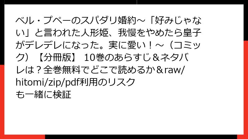 こんにちは、漫画ファンの皆さん! 『ベル・プペーのスパダリ婚約~「好みじゃない」と言われた人形姫、我慢をやめたら皇子がデレデレになった。実に愛い!~(コミック)【分冊版】』は、朝霧あさき原作、セレン作画の心温まる逆溺愛ラブストーリーで、多くの読者を魅了しています。しかし、このような人気作品を、raw、hitomi、zip、pdf、漫画バンクといった海賊版サイトで読もうと考える人もいるかもしれません。今回は、そうした海賊版サイトを利用することのリスクを、詳しくブログ形式で解説します。無料で読める誘惑は魅力的ですが、背後には重大な危険が潜んでいます。しっかりと理解して、正規の方法で漫画を楽しむための参考にしてください!