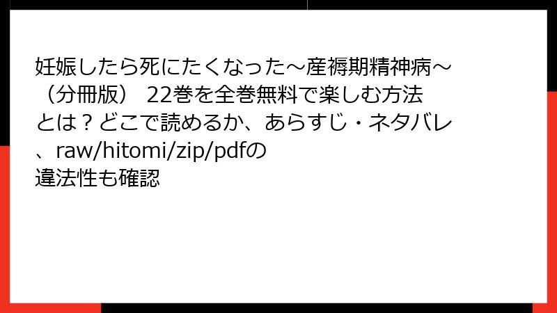『妊娠したら死にたくなった~産褥期精神病~』は、橘ちなつによる実体験を基にした漫画で、産褥期精神病という重いテーマを扱いながら、家族の絆や回復への希望を描いた感動作です。この作品は、リアルな描写と深い感情表現で多くの読者の心を掴み、さまざまなレビューや口コミで高く評価されています。この記事では、読者の声や評判を基に、本作の魅力と反響を詳細に紹介します。特に、22巻を含む最近の展開に焦点を当て、ブログ形式で解説します。