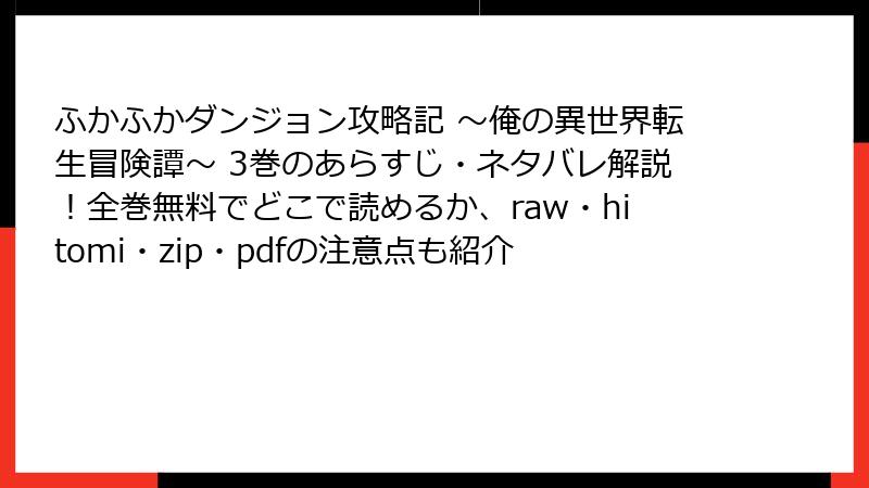 人気の異世界転生漫画『ふかふかダンジョン攻略記 ~俺の異世界転生冒険譚~』を、rawやhitomi、zip/pdfファイル、漫画バンクなどの海賊版サイトで読もうとする人が少なくありません。無料で手軽に全巻楽しめると魅力的に見えますが、こうしたサイトの利用は深刻なリスクを伴います。この記事では、法的問題からセキュリティの脅威、経済・社会的影響まで、具体的に解説します。安全に漫画を楽しむための知識として、ぜひ参考にしてください。利用は絶対に避け、正規ルートをおすすめします。