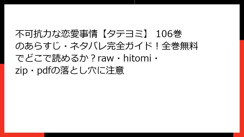 こんにちは、漫画ファンの皆さん! 『不可抗力な恋愛事情【タテヨミ】』は、Ginjyoとuzutokkengによる人気のBLタテヨミ漫画で、芸能界を舞台にした復讐と恋の物語が多くの読者を魅了しています。しかし、無料で読めるという誘惑から、raw、hitomi、zip、pdf、漫画バンクなどの海賊版サイトを利用しようと考える人もいるかもしれません。残念ながら、これらのサイトを利用することは重大なリスクを伴います。この記事では、海賊版サイトで『不可抗力な恋愛事情【タテヨミ】』を読むことの危険性を、ブログ形式で詳しく解説します。法的、倫理的、技術的な観点から、なぜ正規のプラットフォームを選ぶべきかを紐解いていきましょう。さあ、始めます!
