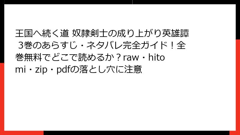 『王国へ続く道 奴隷剣士の成り上がり英雄譚』を海賊版サイトで読むことは、法的トラブル、倫理的問題、技術的リスク、品質の低下など、さまざまな危険を伴います。エイギルの熱い戦いやルーシィとのロマンスを心から楽しむなら、正規の方法で作品を応援するのが一番。海賊版の誘惑に負けず、クリエイターと業界を支える選択をしましょう。この素晴らしい漫画の未来を、ファンの一人として守っていきませんか? 次回のレビューもお楽しみに!