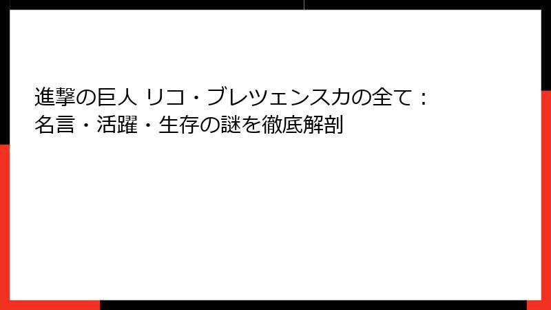 リコ・ブレツェンスカの物語は、彼女の生存、スピンオフでの活躍、ファンコミュニティの愛、そしてテーマ的意義を通じて、『進撃の巨人』の世界に深みを加えます。