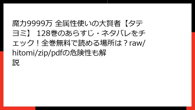 こんにちは、漫画ファンの皆さん! 今回は、HykeComicで連載中の大人気縦読みウェブトゥーン『魔力9999万 全属性使いの大賢者【タテヨミ】』の128巻のネタバレ情報をガッツリお届けします! 原作・脚本は鏑木カヅキ、作画はMUGEN FACTORYによるこのフルカラー作品は、主人公・一神湊の規格外の魔力と全属性を操るバトルが魅力。この128巻では、物語が一気に加速し、過去の因縁や新たな陰謀が明らかに! 以下、ネタバレ全開で詳細に解説しますので、未読の方はご注意を。さっそく、ブログ記事形式で深掘りしていきましょう!