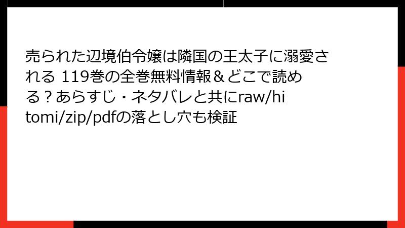 こんにちは、漫画ファンの皆さん! 人気のファンタジーロマンス漫画「売られた辺境伯令嬢は隣国の王太子に溺愛される」をはじめとした作品を、raw、hitomi、zip、pdf、漫画バンクなどの海賊版サイトで読もうとする方は少なくありません。しかし、これらのサイトは「無料で手軽に読める」という魅力の裏側に、深刻なリスクが潜んでいます。このブログ記事では、そんな海賊版サイトの利用がもたらす法的・セキュリティ・経済的な危険性を、詳しく掘り下げて解説します。読み応えを重視して、複数のセクションに分け、箇条書きやテーブルを使ってわかりやすくまとめました。安全に漫画を楽しむための参考にしてください!