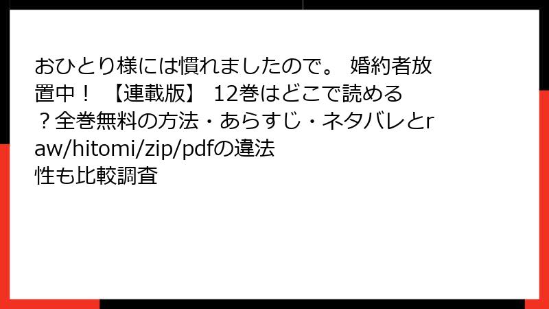 こんにちは、マンガファン必見のセキュリティブロガーです! 今日は、皆さんが気になっているであろう「おひとり様には慣れましたので。 婚約者放置中! 【連載版】」のような人気コミックを、raw、hitomi、zip、pdf、漫画バンクなどの海賊版サイトで読むことのリスクについて、詳しく掘り下げてみましょう。これらのサイトは無料で漫画を提供する魅力がありますが、実は法的な問題からセキュリティの脅威まで、数々の落とし穴が潜んでいます。2025年現在も、これらのサイトはドメインを変えて生き残っていますが、利用者の被害報告が相次いでいます。ネタバレなしで安全に楽しむための知識として、この記事を参考にしてください。海賊版利用は避け、正規ルートをおすすめします!