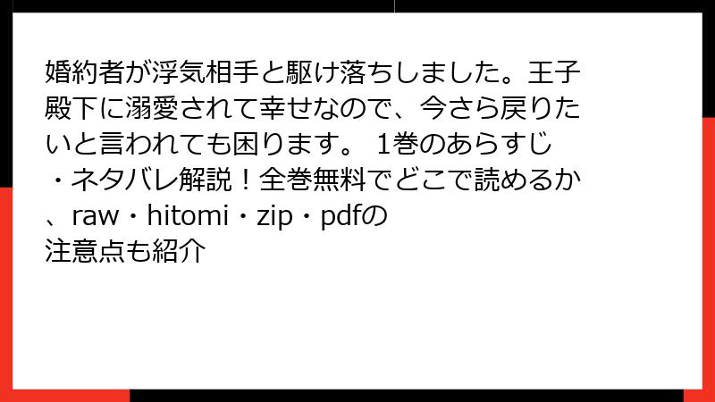 こんにちは、漫画ファンの皆さん! 今回は、ファンタジー恋愛漫画の話題作、婚約者が浮気相手と駆け落ちしました。王子殿下に溺愛されて幸せなので、今さら戻りたいと言われても困ります。の1巻について、読者のレビューや口コミ、評判を徹底的に掘り下げます! 原作は櫻井みことさん、作画はあおいれびんさん、キャラクター原案は黒裄さんによるDREコミックスの人気作。婚約破棄や裏切りからの逆転劇、そして王子様の溺愛が魅力のこの作品は、2025年現在、SNSやレビューサイトで熱い注目を集めています。以下では、読者の声や評価を基に、物語の魅力や賛否両論をブログ形式で詳しく紹介します。まだ読んでいない方も、購入の参考にしてください!