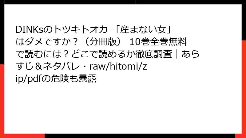 こんにちは、漫画レビューを愛するブロガーです! 今回は、北実知あつき先生による「DINKsのトツキトオカ 「産まない女」はダメですか?(分冊版)」の10巻に焦点を当て、詳細なネタバレ情報をブログ記事形式でお届けします。このシリーズは、子どもを持たない選択をした共働き夫婦(DINKs:Double Income No Kids)のリアルな葛藤や社会的な圧力を描いた作品で、女性読者を中心に深い共感を呼んでいます。10巻は物語のターニングポイントとなる重要な巻で、感情の揺れや衝撃的な展開が満載です。以下、ネタバレ全開で解説するので、未読の方はご注意ください! 読み応えのある内容にするため、