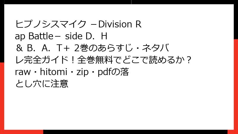 「ヒプノシスマイク -Division Rap Battle- side D.H & B.A.T+」2巻を海賊版サイトで読むことは、法的リスク、倫理的問題、技術的危険、品質低下など、多くのデメリットを伴います。以下に、なぜ海賊版を避けるべきかを再確認します。