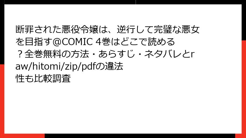 こんにちは、マンガファンの皆さん! 人気の悪役令嬢コミック「断罪された悪役令嬢は、逆行して完璧な悪女を目指す@COMIC」をはじめ、さまざまな作品を無料で読みたいという気持ちはわかります。でも、raw、hitomi、zip、pdf、漫画バンクなどの海賊版サイトを利用するのは、非常に危険です。これらのサイトは、違法にアップロードされた漫画を提供するもので、法的・セキュリティ・倫理的なリスクが満載。今日は、そんなリスクを詳しく掘り下げてお伝えします。ブログ形式で読みやすくまとめましたので、参考にしてください。海賊版サイトは絶対に避け、正規の方法で楽しむことをおすすめします!