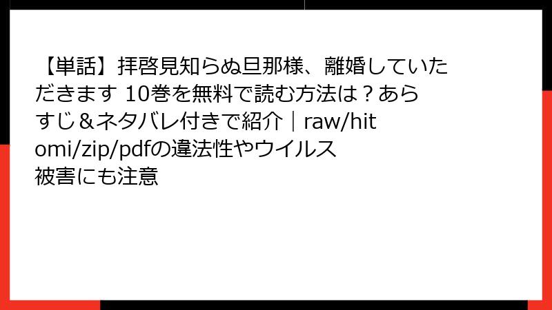 こんにちは、漫画ファンの皆さん! 今日は、人気の漫画『【単話】拝啓見知らぬ旦那様、離婚していただきます』を、raw、hitomi、zip、pdf、漫画バンクなどの海賊版サイトで読もうとする場合のリスクについて、詳しくお話しします。このようなサイトは一見便利に見えますが、実際には法律的な問題からセキュリティの脅威まで、数多くの危険が潜んでいます。2025年現在、海賊版サイトの取り締まりが強化されており、利用者の被害事例も増えています。以下では、ブログ記事風に複数のセクションで読み応えのある内容をお届けします。安全に漫画を楽しむための参考にしてくださいね。なお、海賊版サイトの利用は強くおすすめしません。正規の電子書籍サービスを利用しましょう。